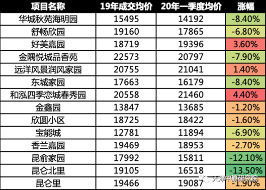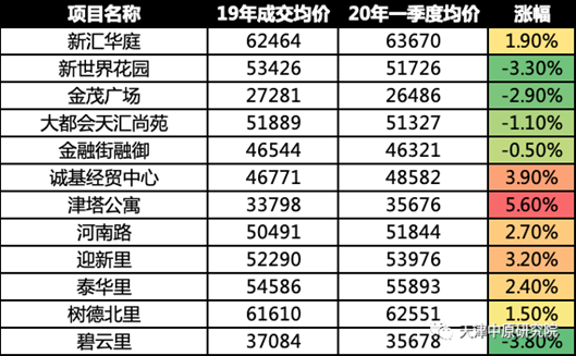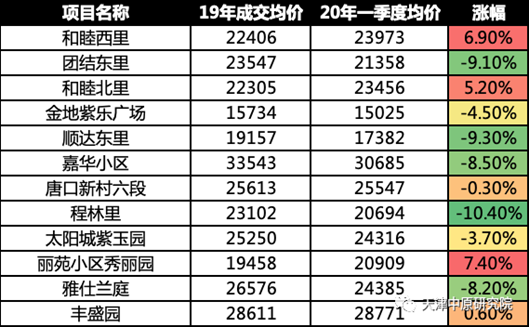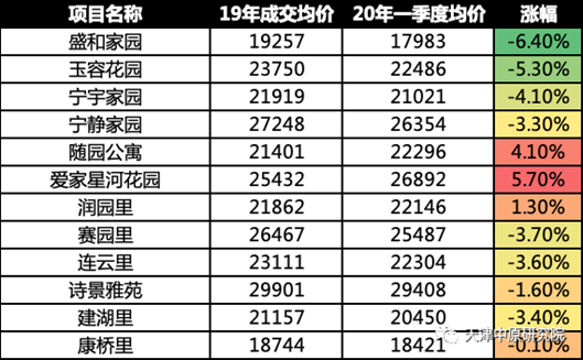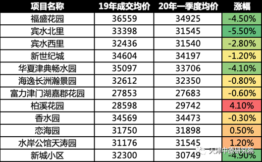 2020年一季度二手房成交主要集中在3月中下旬,成交客户主要为四类:落户需求客户、“新天津人”自住客户、学区需求客户及19年四季度末以来积压的改善客户,以下就此四类客户集中的热点社区时点价格及与19年相比的价格变化情况进行盘点: