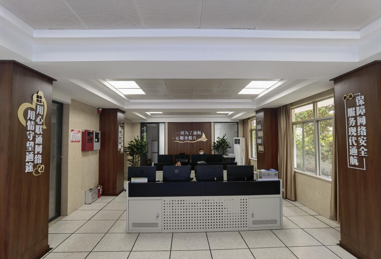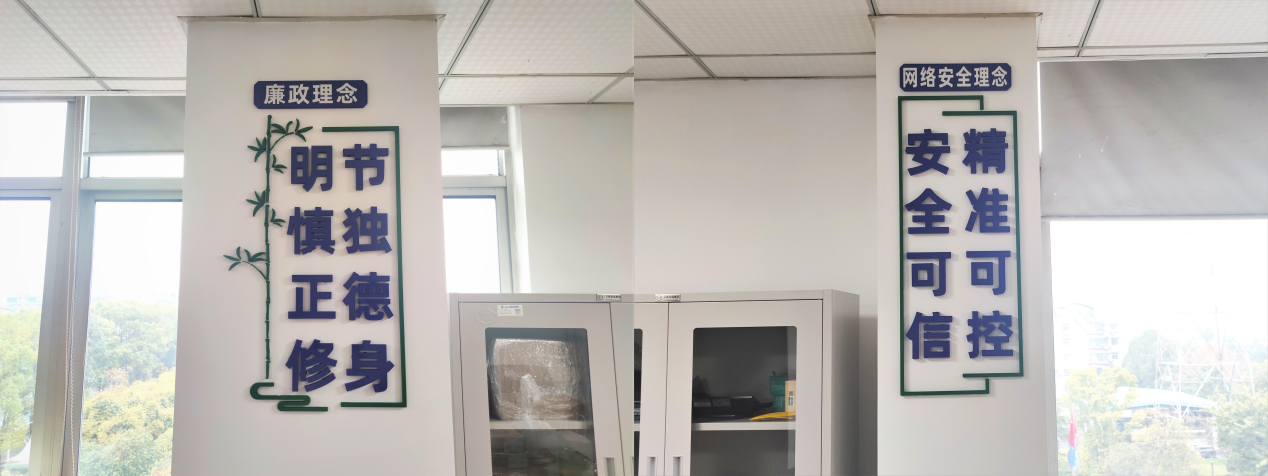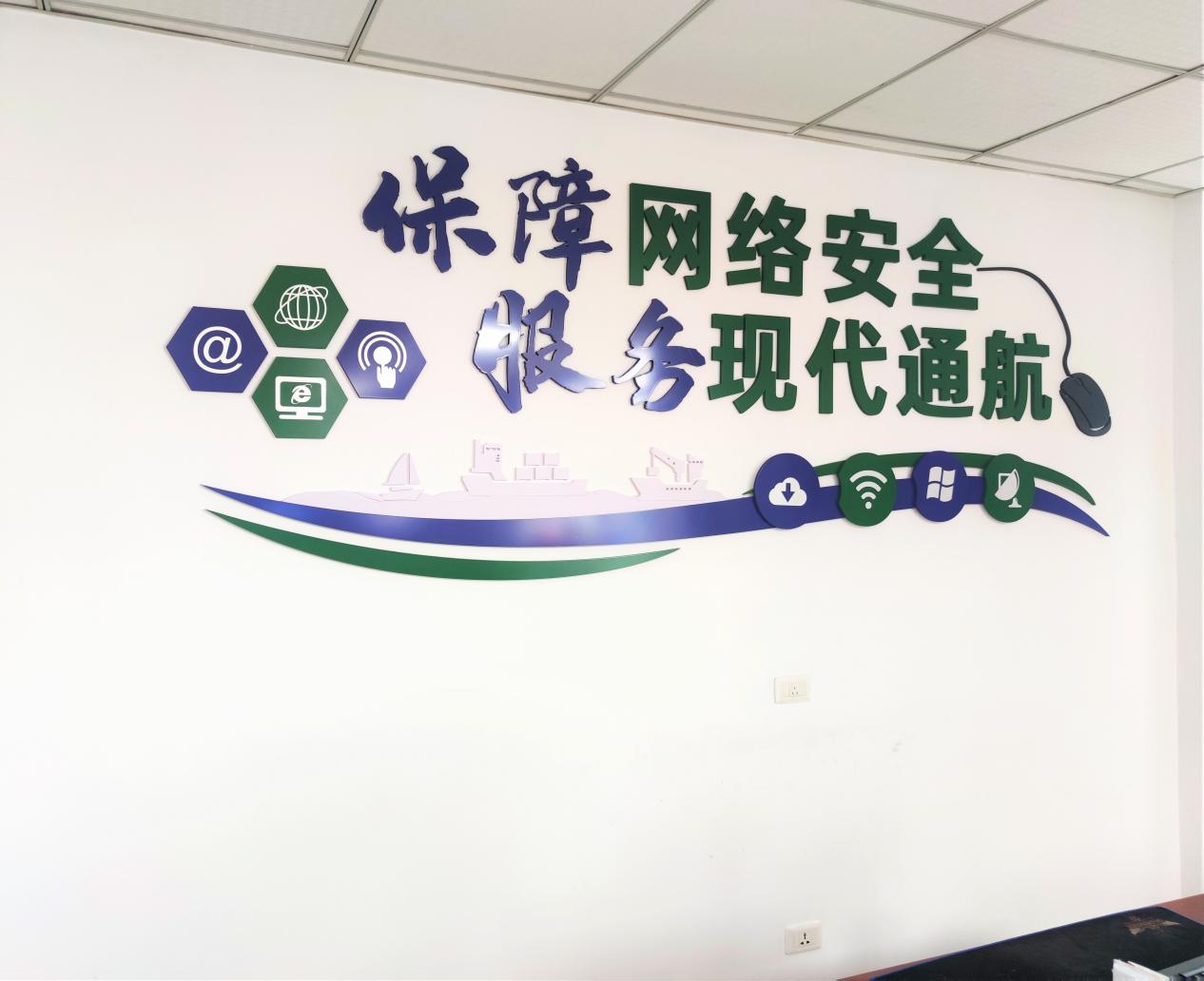 网络传输部办公区域首先出现在眼前的是“保障网络安全,服务现代通航”的使命,右手边柱子上是网络安全理念、廉政理念等。