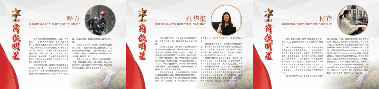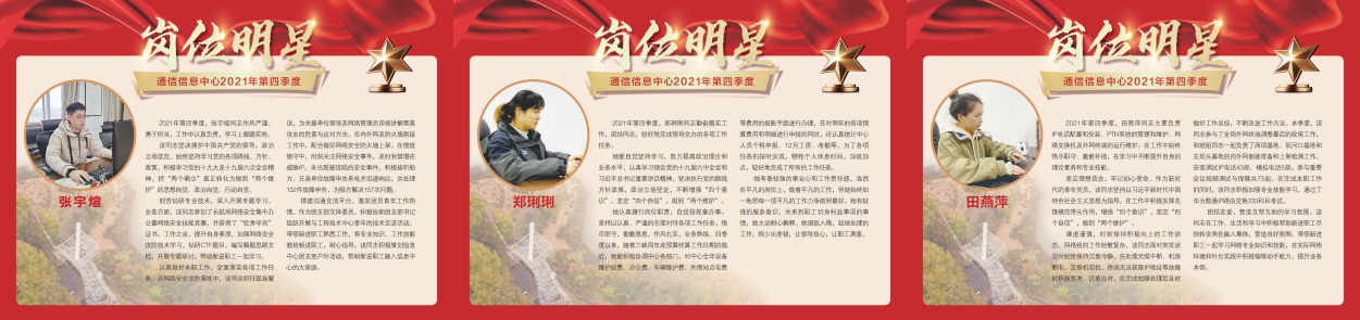 挖掘先进典型,评选岗位明星。“型,筑器之法也”。做好先进典型的工作,对弘扬信息中心精神,加强中心文化建设,调动职工的积极性、主动性具有重要意义。信息中心十分注重挖掘工作中的先进典型,积极宣传“身边的榜样”,认真落实《我身边的榜样——岗位明星评选方案》。每季度信息中心开展岗位明星评选活动,由各办公室、各班组进行民主推荐,根据推荐情况在信息中心范围内进行投票。并统一制定宣传展板,在信息中心内部进行广泛宣传,让职工学习他们的积极进取、昂扬向上的精神,营造向先进看齐的良好氛围,充分发挥榜样引领的作用。