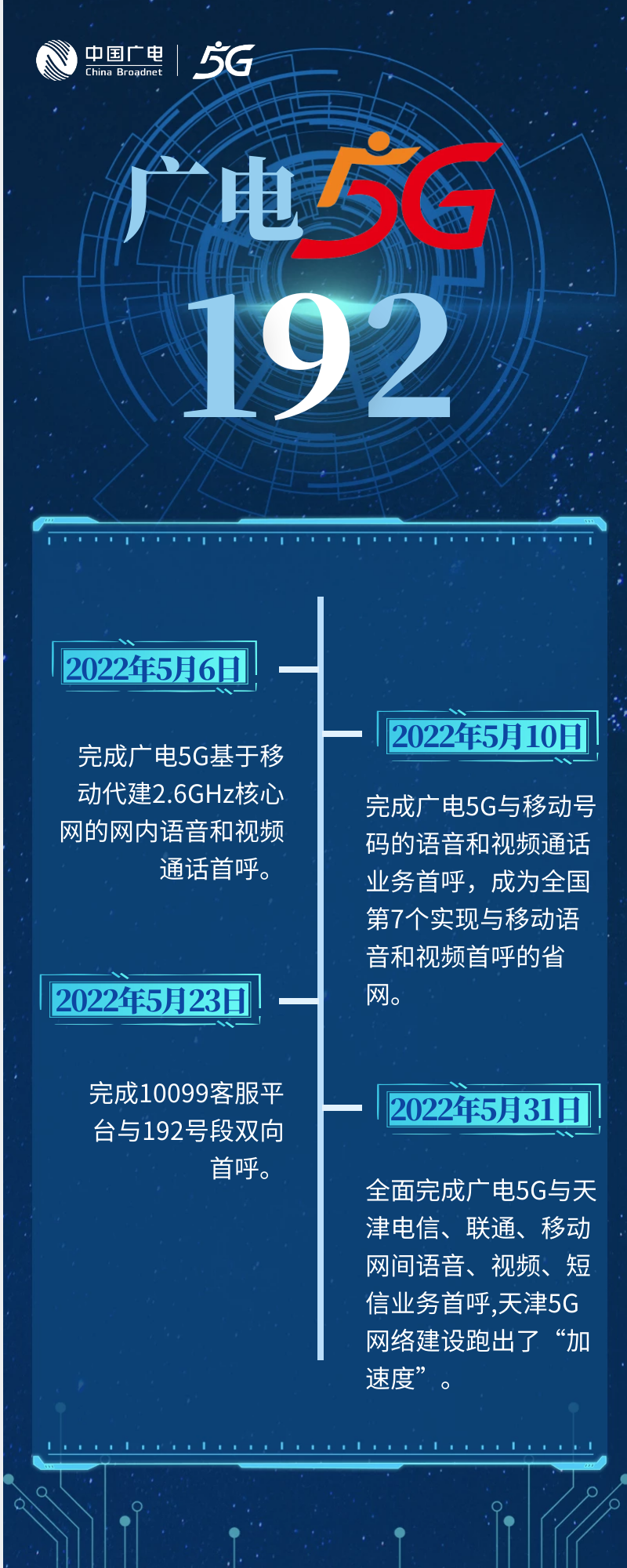 今年以来,中国广电天津网络有限公司全力推进广电5G在津落地及192移动业务开通工作,仅用半年时间,相继完成广电5G核心网天津省级节点开工建设、与三大运营商的互联互通及联调测试、5G分公司注册落户、营业厅升级、品牌焕新等重点核心任务,得到了中国广电总部的高度认可。天津5G网络建设跑出了“加速度”,彰显出不惧挑战、勇于创新、敢为人先的广电精神。