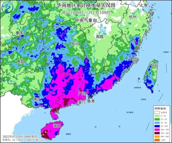 受其影响,7月1日至3日,海南岛、广东中西部和南部沿海、广西东南部、湖南南部、福建东南部等地出现大暴雨或特大暴雨,海南岛西南部、广东西南部等局地累计降雨量达400~500毫米,海南昌江达581毫米;海南、广东、广西等地超过50个测站的日雨量达到特大暴雨量级,海南三亚国家气象观测站突破当地日雨量历史极值。