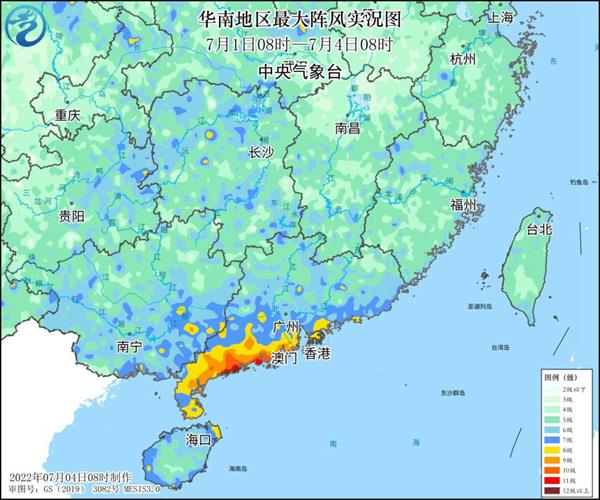 同时,南海大部海域及西沙群岛、中沙群岛、华南沿海出现了6~8级大风,珠江口外海面、海南岛东北部海面、西沙群岛附近海域出现10~11级阵风,广东西部沿海海面和陆地出现13~14级阵风,广东阳江阳西县大树岛观测到15 级阵风(45.8 米/秒)。