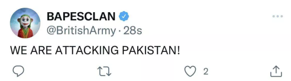 另据英国《卫报》新闻网站报道,英国陆军推特、优兔等社交平台账号遭黑客入侵,被黑客入侵的账号名称至少被更改过两次,头像被替换成机器人、卡通猴子等。此外,帖文也出现混乱,一会发布非同质化代币(NFT)的内容,一会又出现特斯拉CEO马斯克的采访视频。一则“我们正在攻击巴基斯坦”的帖子更是让网友大跌眼镜。