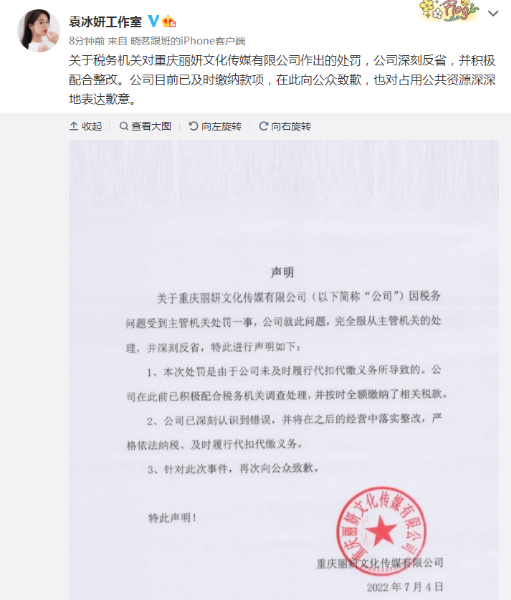 7月4日午后,袁冰妍工作室发布声明称,关于税务机关作出的处罚,公司深刻反省,并积极配合整改。公司目前已及时缴纳款项,在此向公众致歉,也对占用公共资源深深地表达歉意。