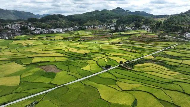 初秋,贵州省贵阳市开阳县禾丰乡马头村近千亩优质稻谷长势喜人,田园、村庄、河流、乡村公路组成一幅贵州高原独特的田园丰收画卷。