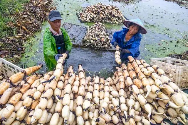 眼下,江苏省泰州市姜堰区顾高镇夏庄村的浅水藕迎来丰收,藕农们忙着采收、清洗、分拣、加工莲藕,供应市场。
