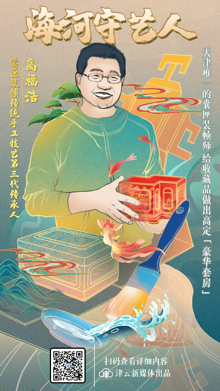 高福浩作为天津市河东区非遗项目囊匣装帧传统手工技艺第三代传承人,从12岁起便与外婆李淑芳一起练习囊匣制作。他说,现在天津的囊匣装帧领域成了他一个人的“战场”,虽然焦虑和彷徨总是冲击着他的内心,但依然坚守着,对这份事业不离不弃。