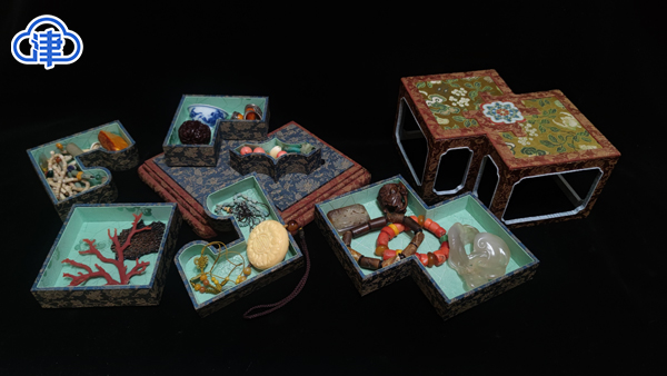 他拿出一个装有点翠蝶钗的囊匣,“我把蝴蝶图案的头钗设计成了插在山石木刻画中,一来减少对点翠的触摸,二来蝴蝶和山石交相呼应,设计的十分巧妙。”随后他又拿出了一个装有首饰的福寿齐眉多层方胜锦盒,“方胜,是以两个菱形压角相叠而构的几何图形或纹样,在我国古代的花瓶、窗格中经常能够见到。”高福浩说,他将方胜盒设计为三层,拼接后每一层的内部结构都有所不同,同时外表的锦布能够完全拼成一幅画,既融汇了我国传统文化中的几何美学,又增添了囊匣的趣味性。