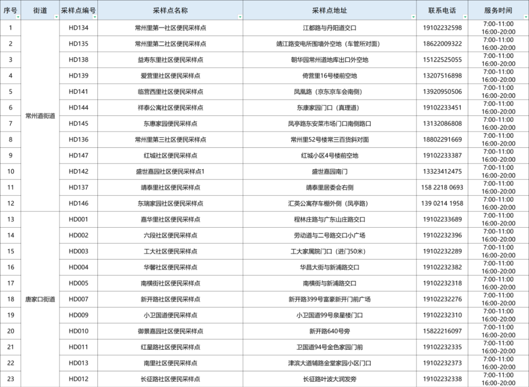 为满足广大居民核酸检测需求,方便群众进行核酸检测,东丽区对常态化核酸采样点位进行了优化调整,常态化核酸检测采样点具体点位和每日工作时间附后。请有需求的居民合理安排时间,就近前往采样点参加常态化核酸检测。