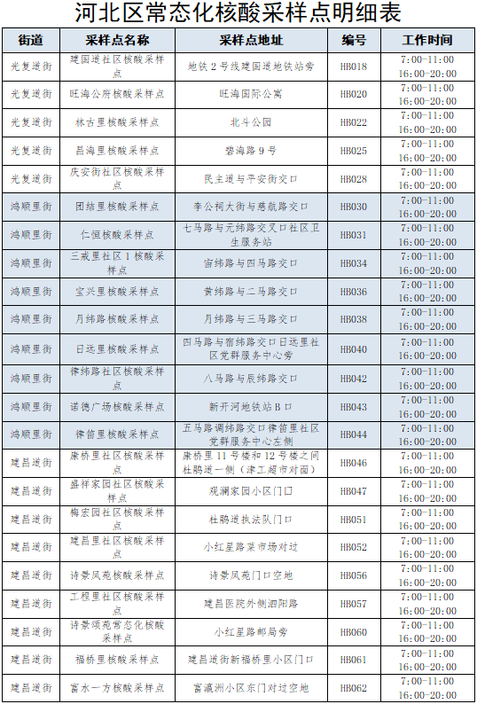 为满足广大居民核酸检测需求,北辰区对常态化核酸采样点位进行了调整,具体点位明细附后。请有需求的居民按照相关要求,结合生活工作实际,合理安排时间,就近前往采样点参加常态化核酸检测。北辰区疫情防控指挥部将根据疫情防控工作实际动态调整核酸采样点位及服务时间,请广大居民及时关注采样点信息(以采样点张贴公示为准),如有调整将第一时间告知。