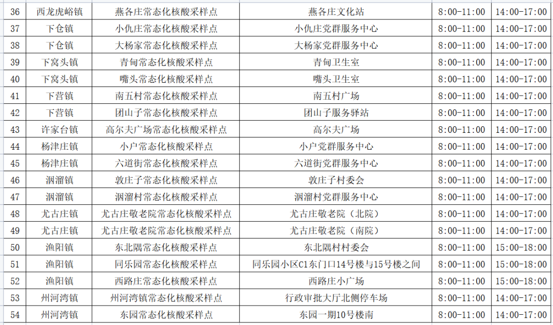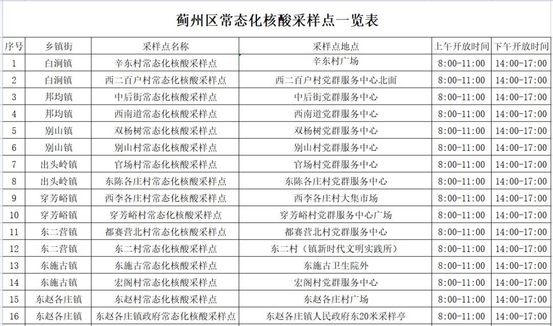 为满足广大居民常态化核酸检测需求,蓟州区对常态化核酸采样点位进行了调整(具体点位和开放时间附后)。居民朋友若有出行、查验等需求的,请结合工作和生活实际,合理安排时间,就近到常态化核酸检测点采集核酸。