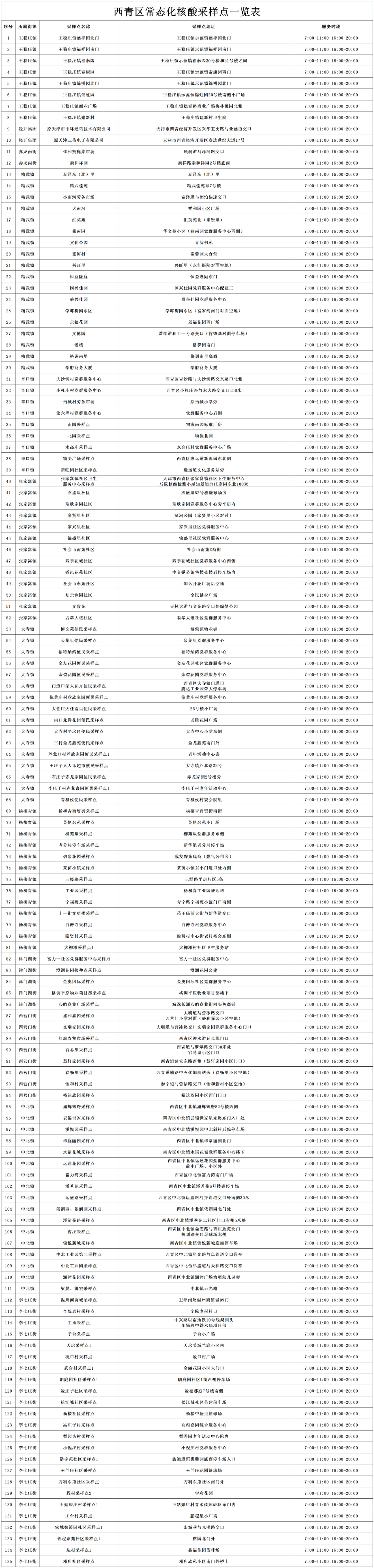 为满足广大居民核酸检测需求,方便群众进行核酸检测,西青区对常态化核酸采样点位进行了优化调整,常态化核酸检测采样点具体点位和每日工作时间附后。请有需求的居民合理安排时间,就近前往采样点参加常态化核酸检测。
