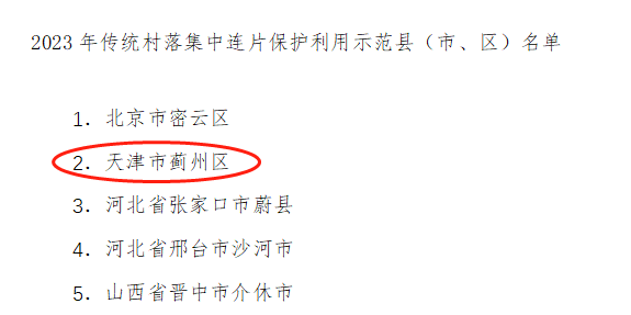 在住房和城乡建设部等部门发布的第六批列入中国传统村落名录村落名单中,天津有4个村落上榜,均在蓟州区:蓟州区渔阳镇小龙扒村、蓟州区渔阳镇桃花寺村、蓟州区穿芳峪镇小穿芳峪村、蓟州区孙各庄满族乡隆福寺村。而在此前公布的五批名单中,天津也有4个村落列入传统村落名录——蓟州区渔阳镇西井峪村、西青区杨柳青镇六街村、蓟州区下营镇黄崖关村、宝坻区八门城镇陈塘庄村。