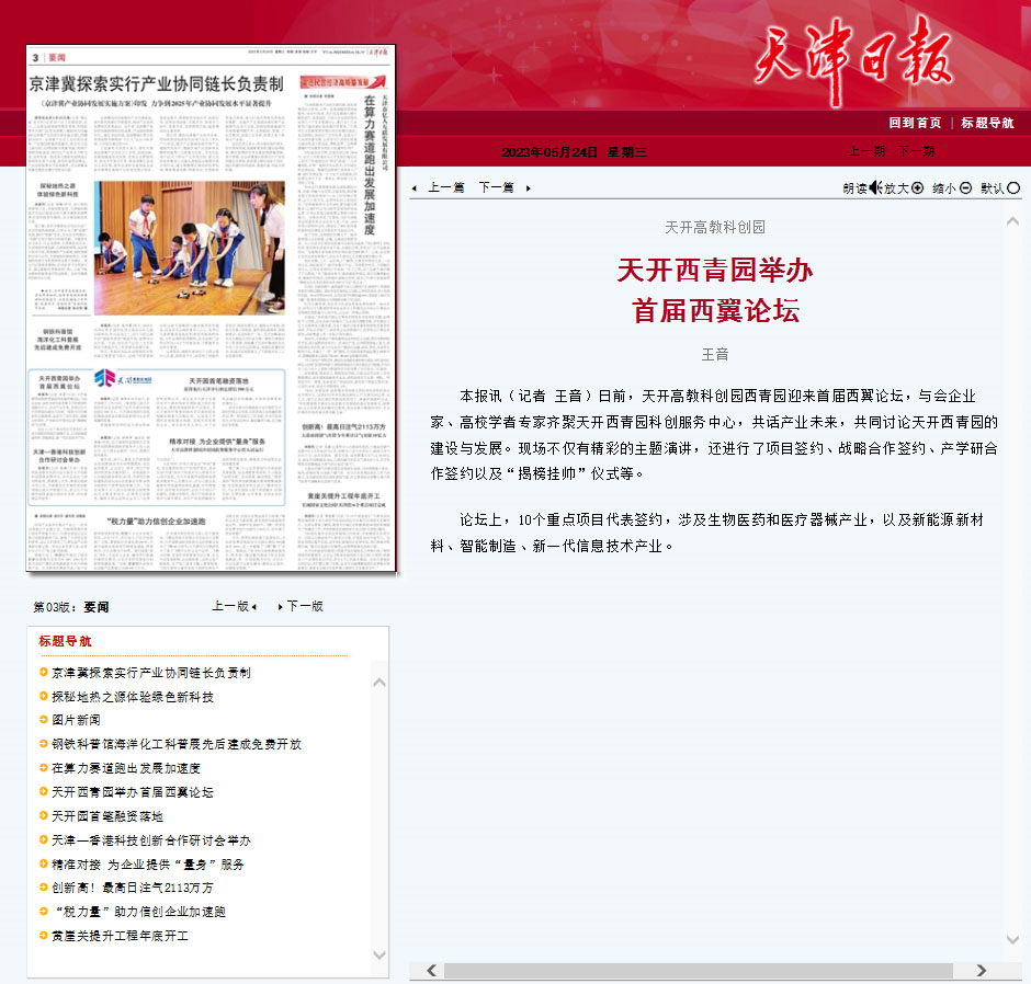 《天津日报》刊发文章《天开西青园举办 首届西翼论坛》,报道了在天开高教科创园西青园的首届西翼论坛上,与会企业家、高校学者专家齐聚天开西青园科创服务中心,共话产业未来,共同讨论天开西青园的建设与发展。