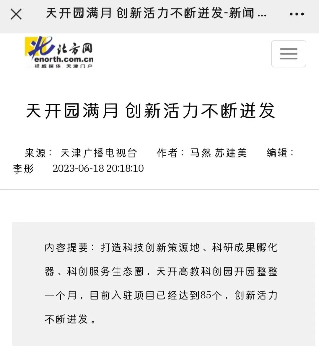 天津广播电视台《天津新闻》刊播新闻《天开园满月 创新活力不断迸发》,报道了天开西青园开园一个月的最新进展成效。