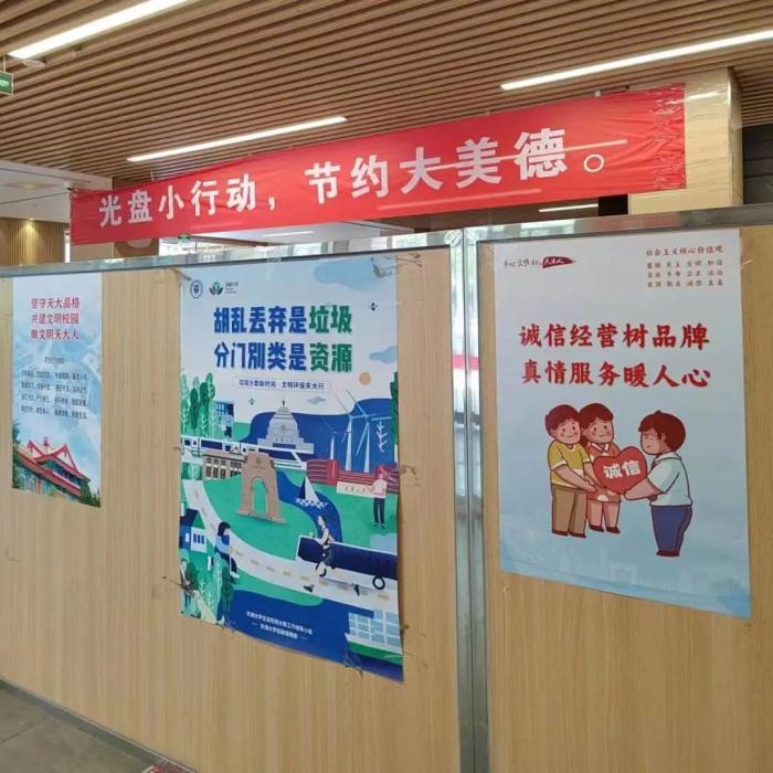 学校还举办毕业季跳蚤市场、爱心捐赠、旧物回收等活动,推动资源循环再利用,践行绿色低碳的生活方式。学校加强节俭养德、文明餐桌、垃圾分类等宣传教育,通过海报、条幅、电子屏等宣传载体倡导文明新风尚。